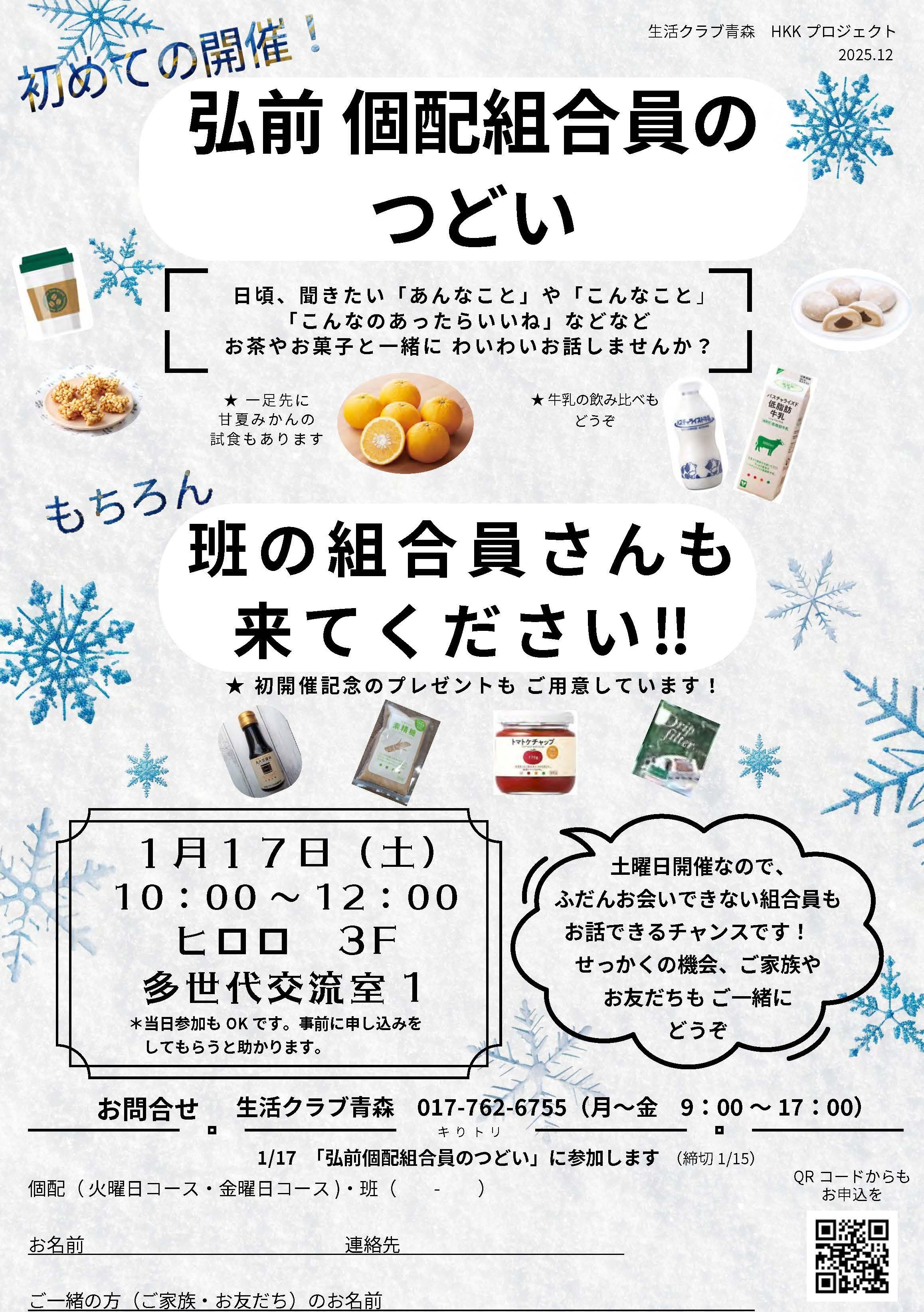 | お問い合わせ・お申し込み | 生活クラブ青森 電話:017-762-6755(月〜金 9:00〜17:00) 下記のURLからもお申し込みできます。 https://mail-to.link/m9/3ua6h3f ※「メール作成画面はこちら」をクリックしていただくと、件名「「弘前個配組合員のつどい(班も歓迎)」に参加します」と本文、宛先が自動的にセットされます。 宛先のドメインは s-club.coop です。 |